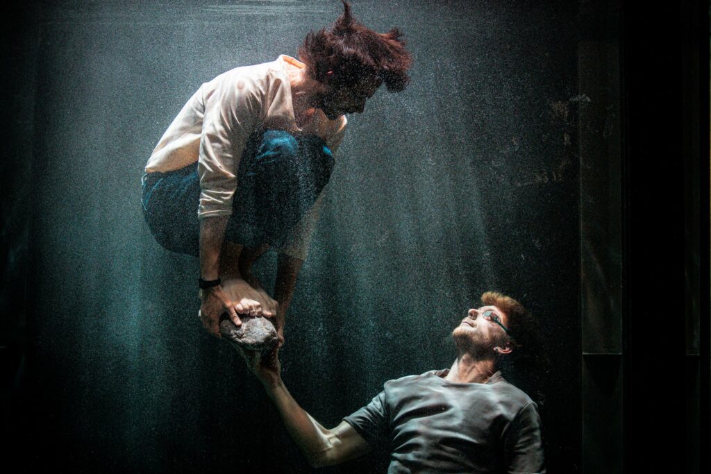 Plongeant tour à tour et ondulant dans un aquarium géant installé sur le plateau du théâtre Montfort, ces deux jeunes professionnels du cirque, par ailleurs nageurs et apnéistes passionnés, accomplissent une performance aussi poétique que parfaitement réglée. Incroyablement inventifs, ils jouent avec virtuosité de l’air et de l’eau dans un silence aquatique parfois perturbé par d’inévitables éclaboussures. Un enchantement !